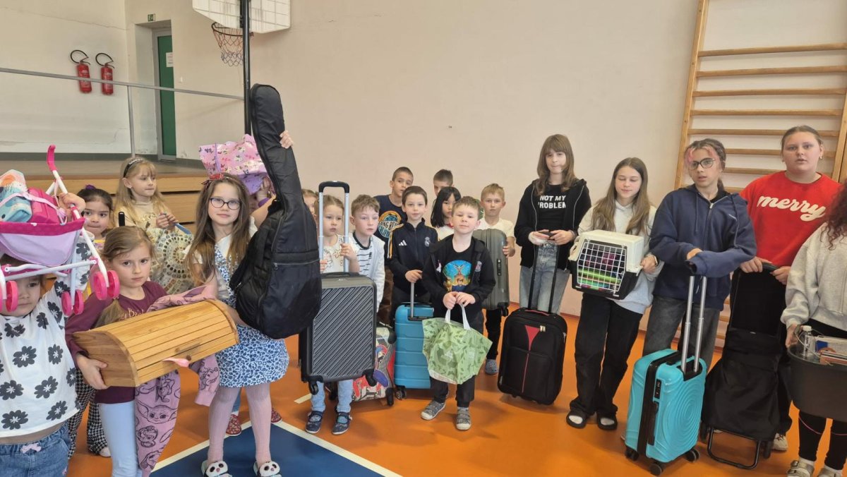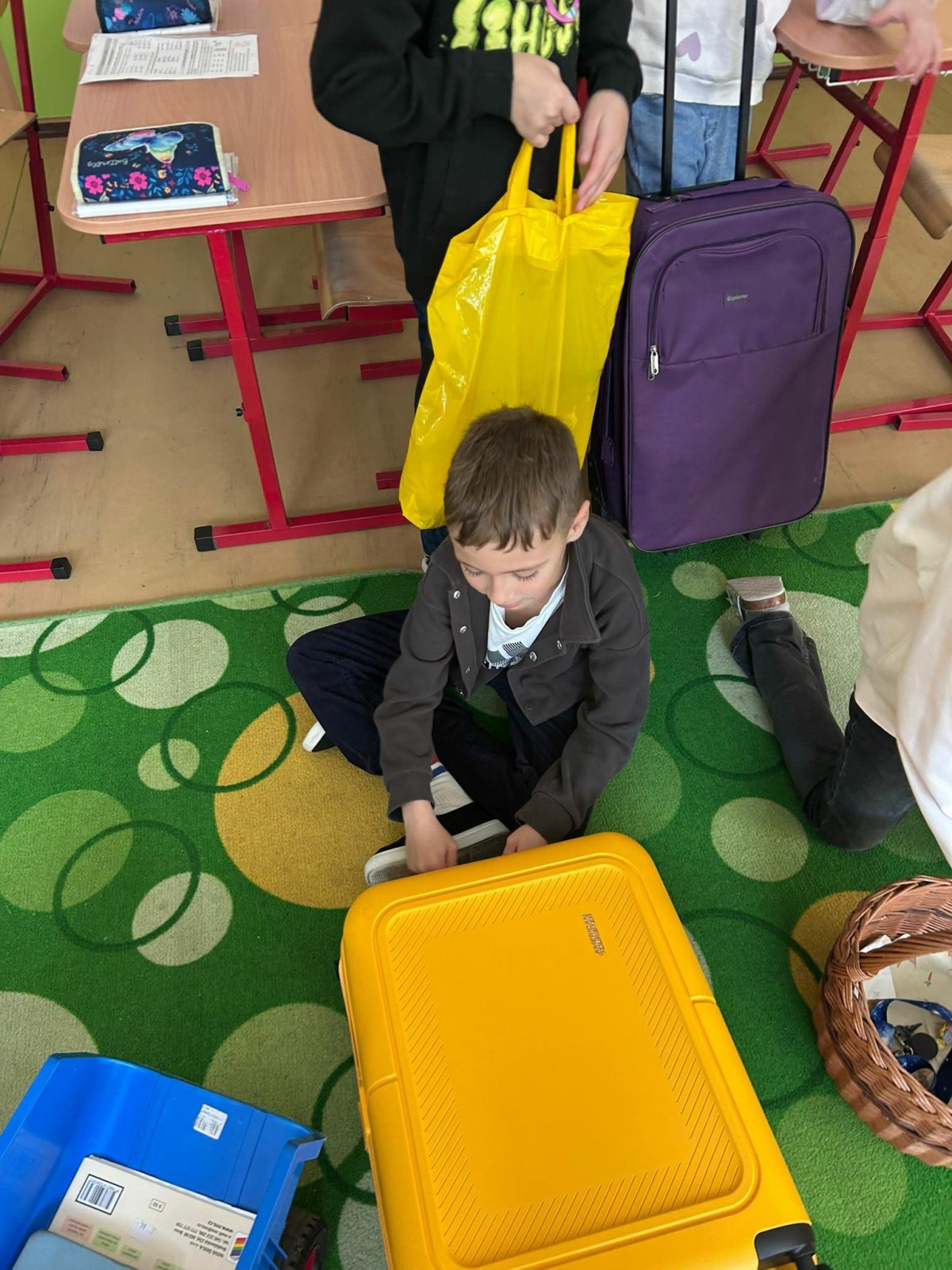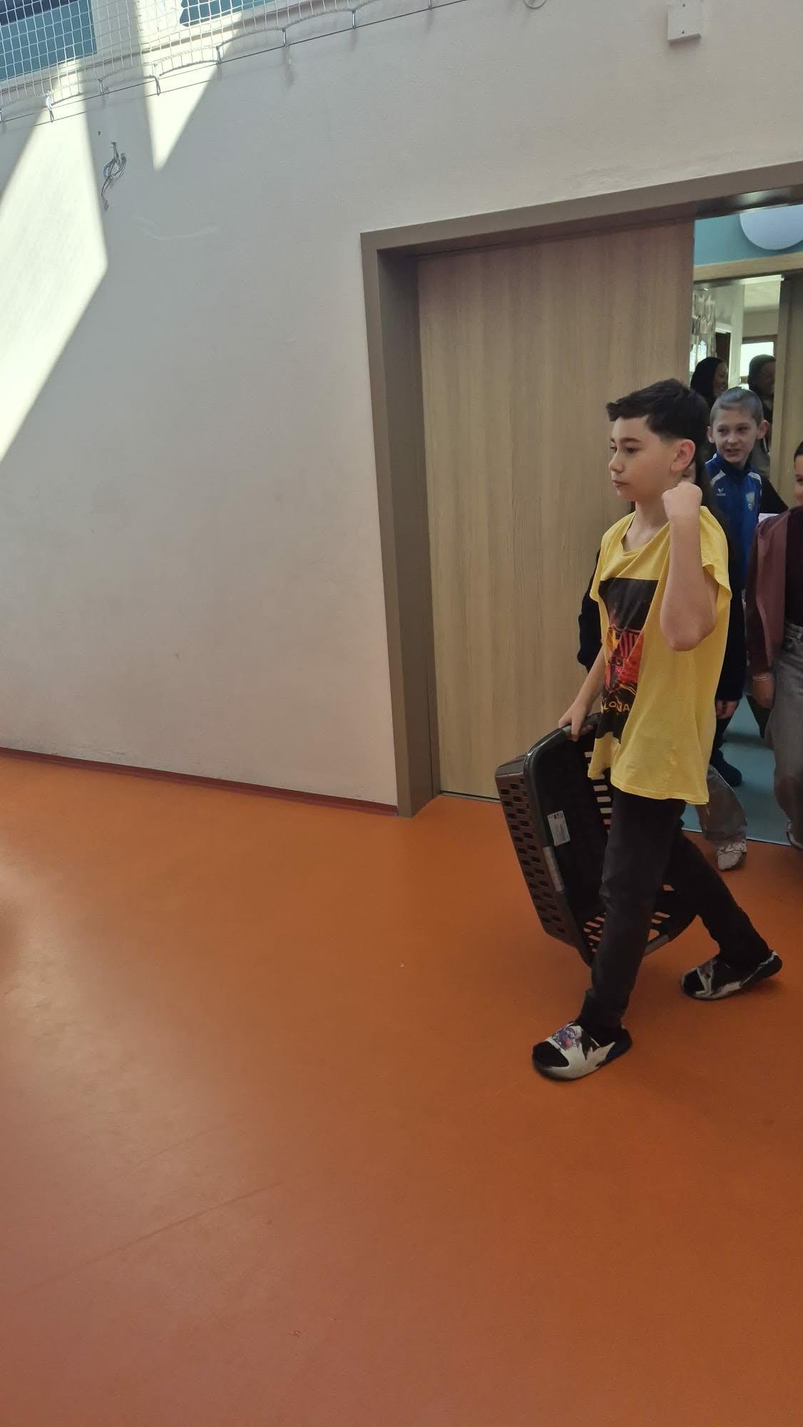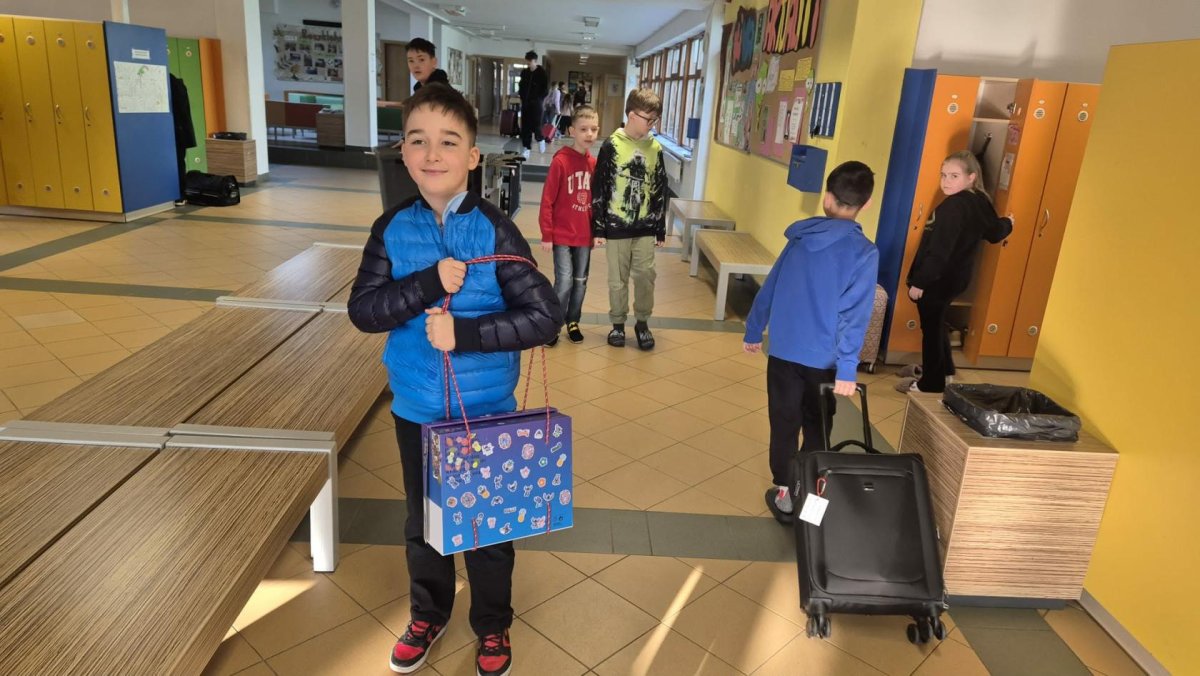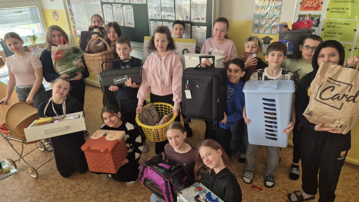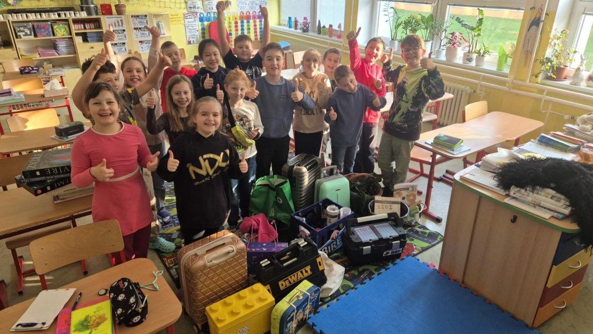 V rámci aprílového dne děti dorazily vybavené naprosto skvěle! Učebnice se vezly v nákupních vozících,sešity odpočívaly v hrncích...a někteří školáci dorazili i s výbavou,která by obstála i na expedici do divočiny...