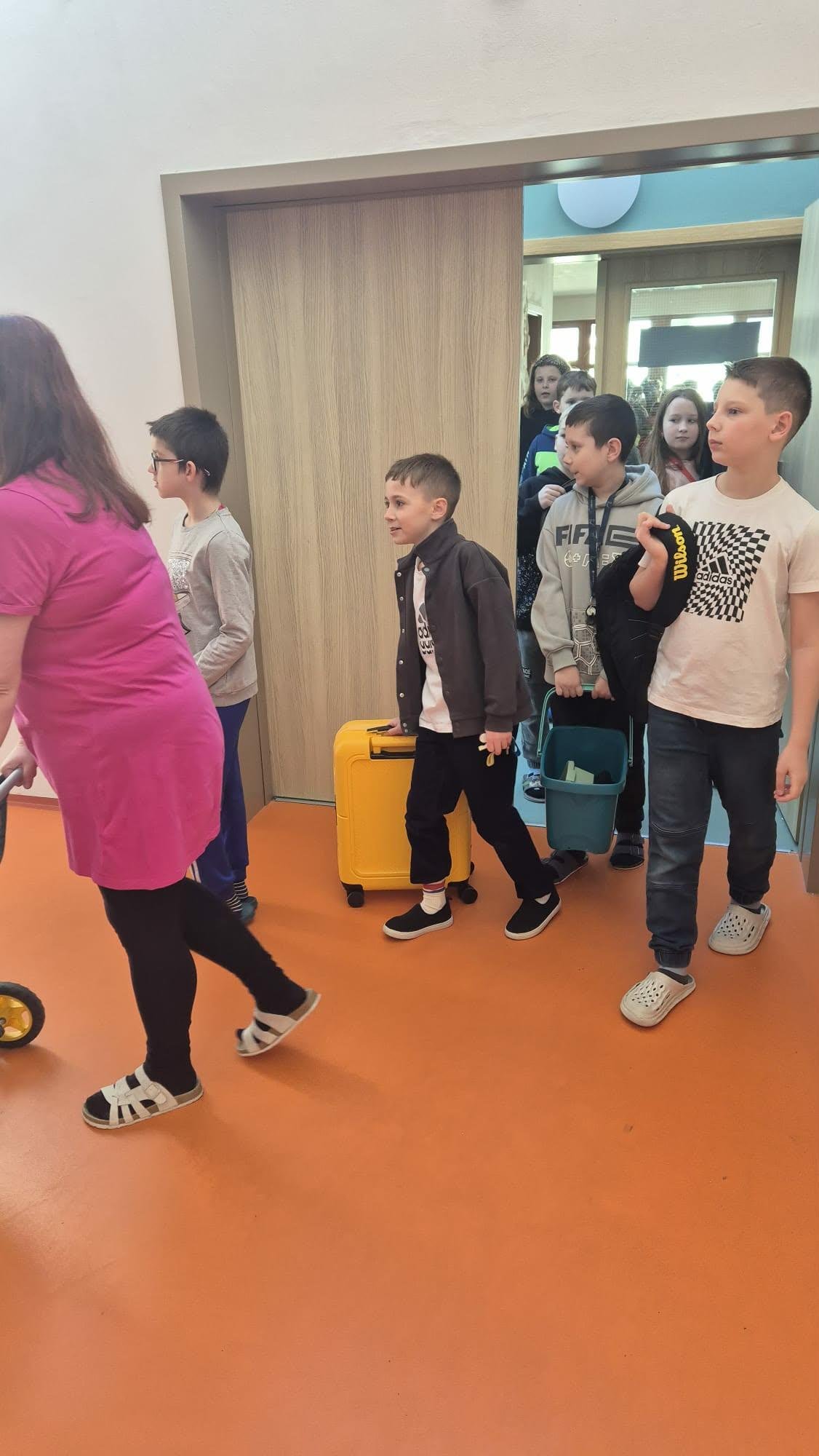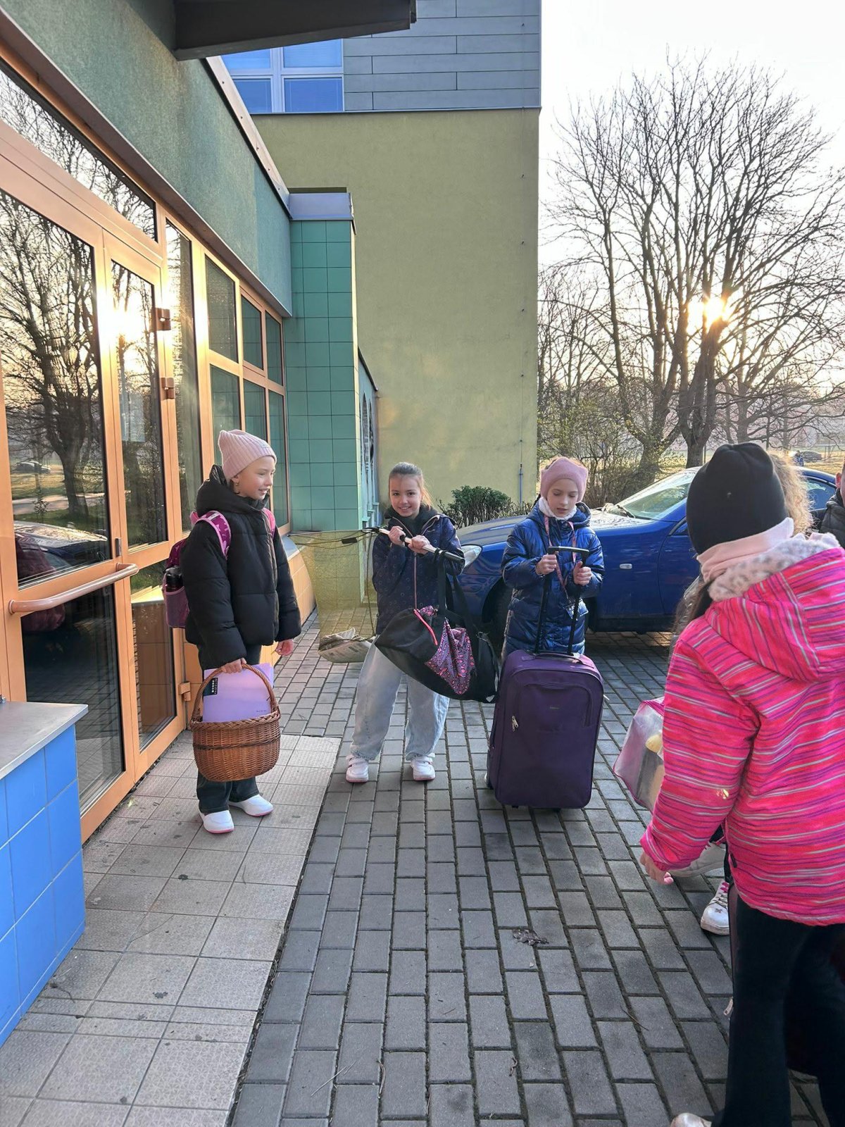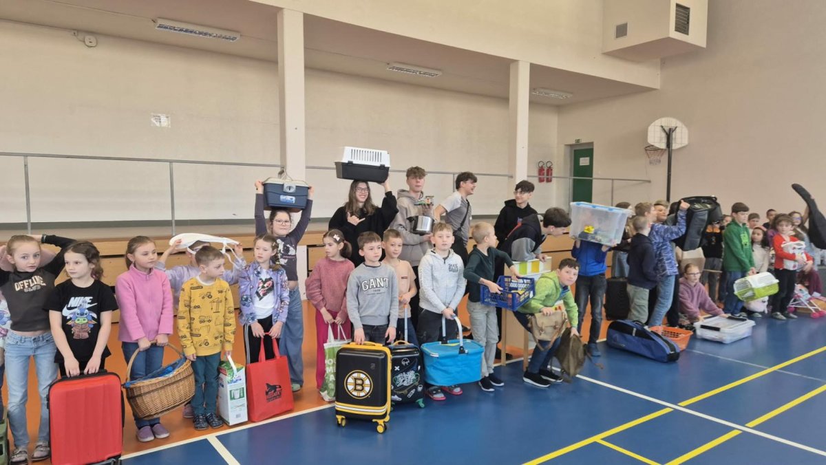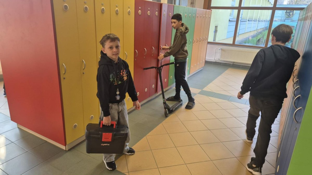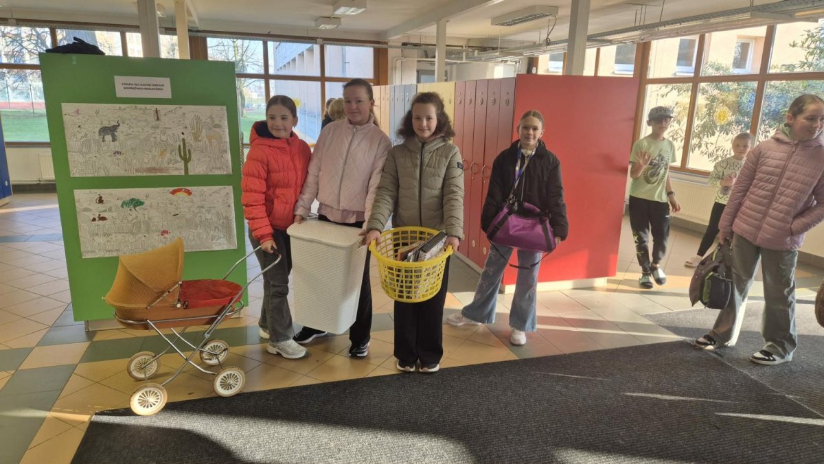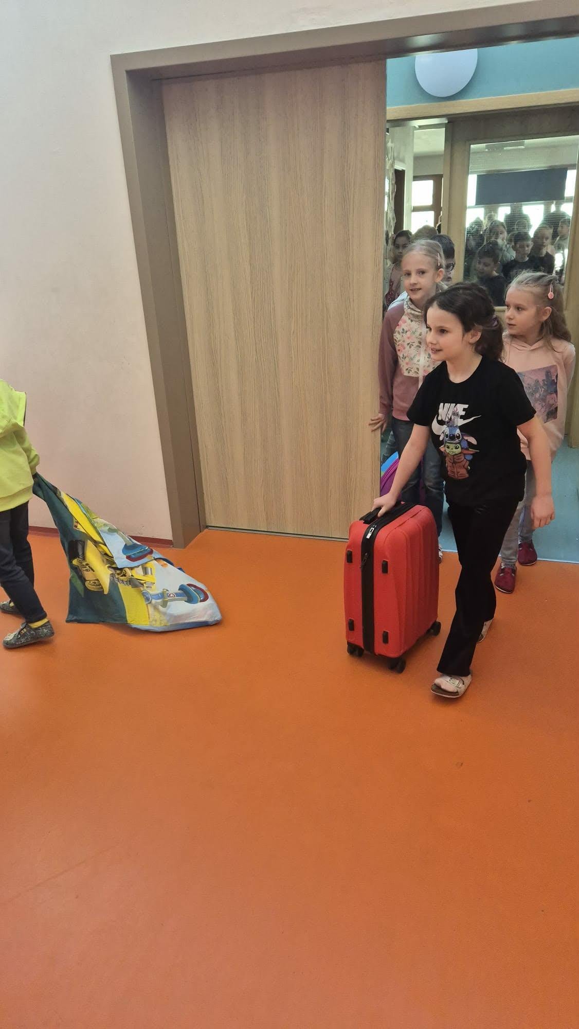 V rámci aprílového dne děti dorazily vybavené naprosto skvěle! Učebnice se vezly v nákupních vozících,sešity odpočívaly v hrncích...a někteří školáci dorazili i s výbavou,která by obstála i na expedici do divočiny...