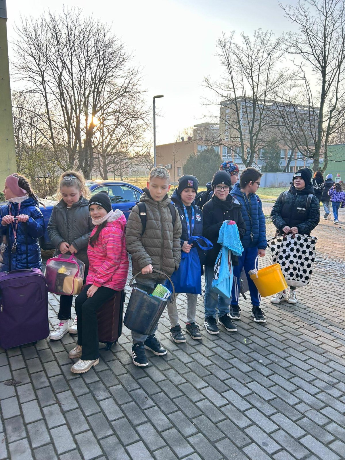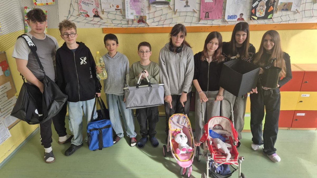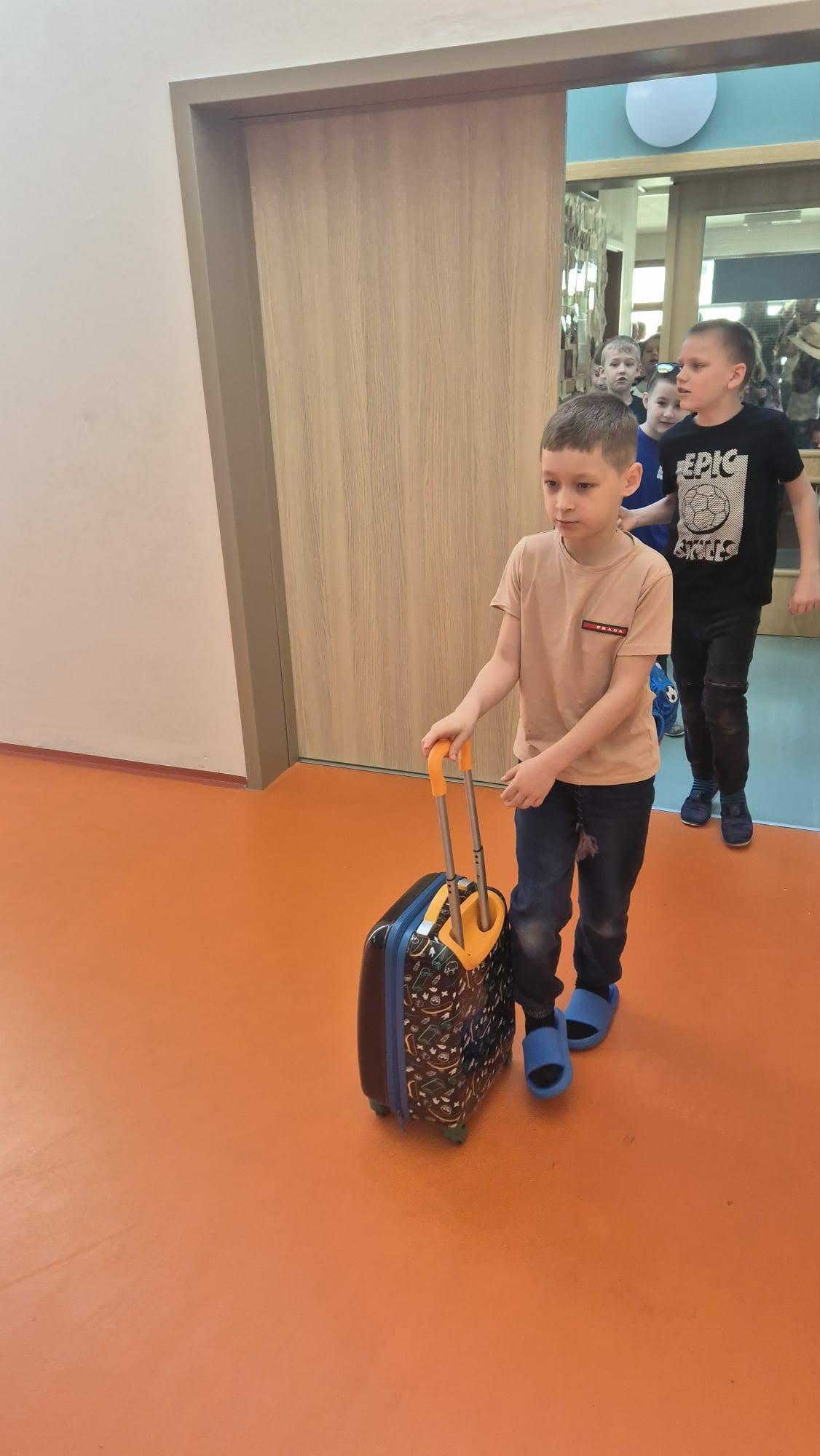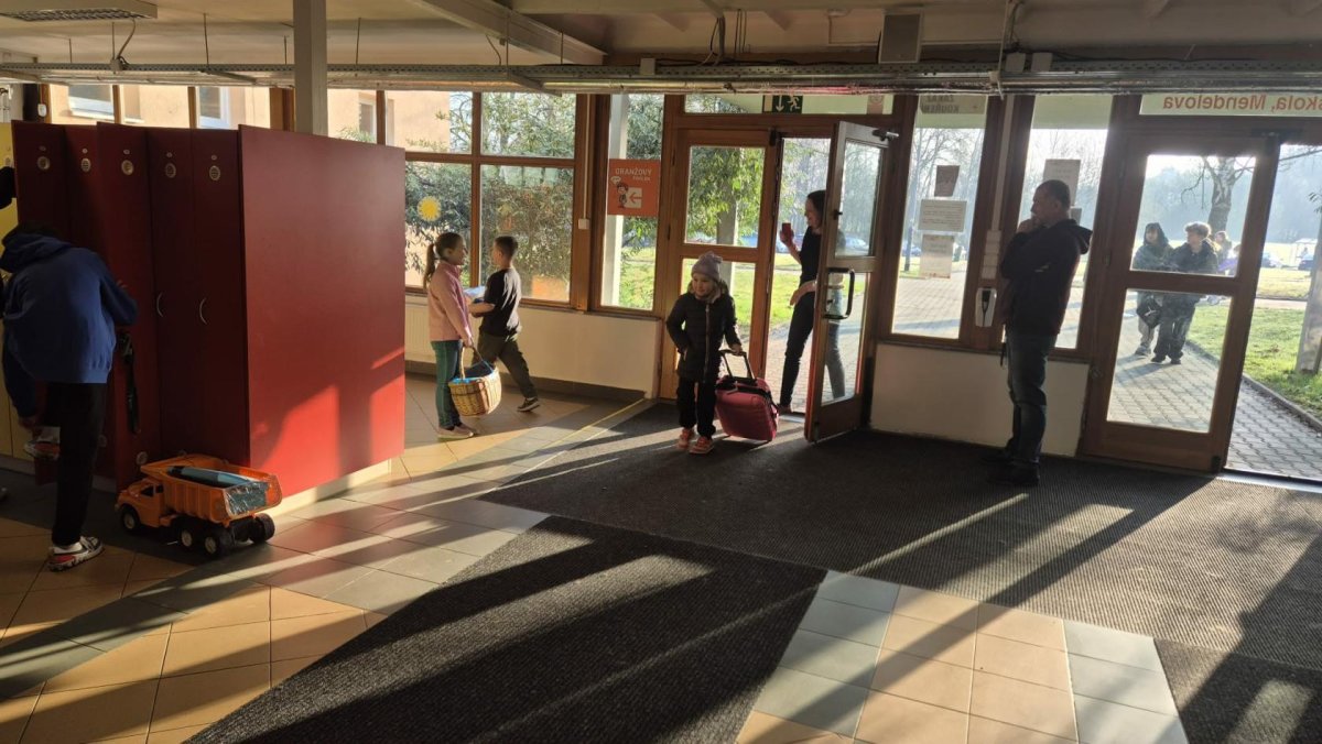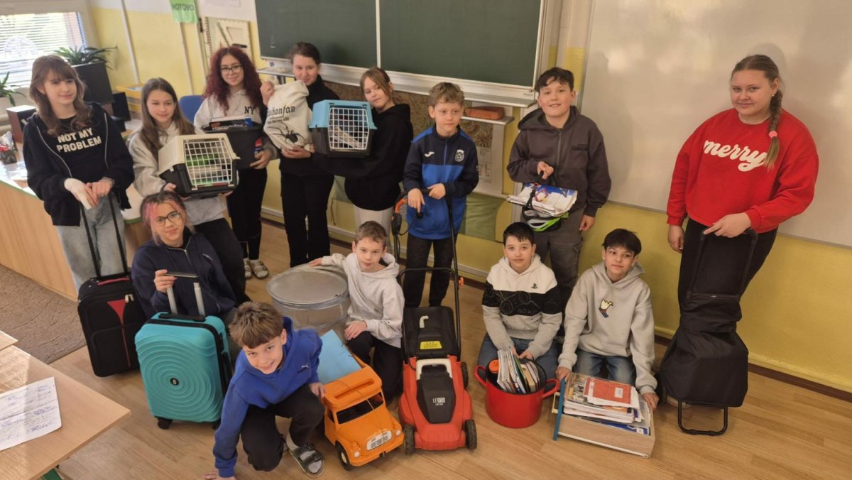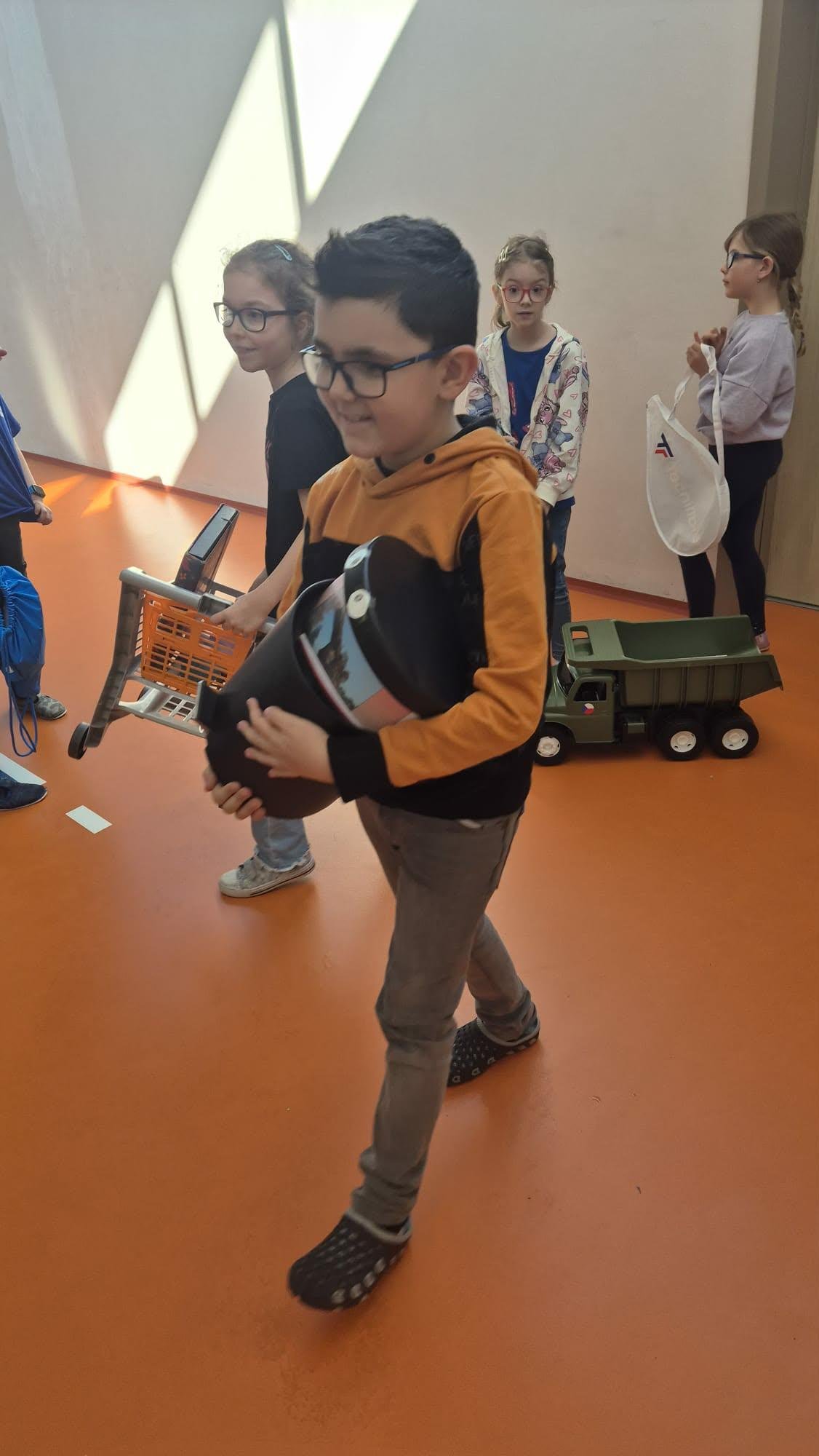 V rámci aprílového dne děti dorazily vybavené naprosto skvěle! Učebnice se vezly v nákupních vozících,sešity odpočívaly v hrncích...a někteří školáci dorazili i s výbavou,která by obstála i na expedici do divočiny...