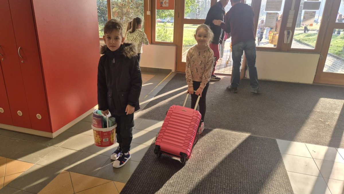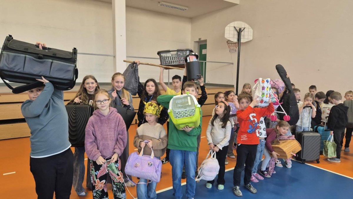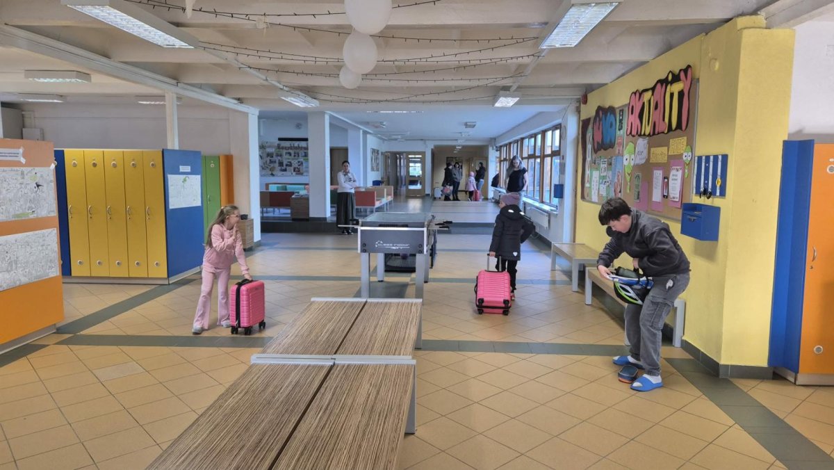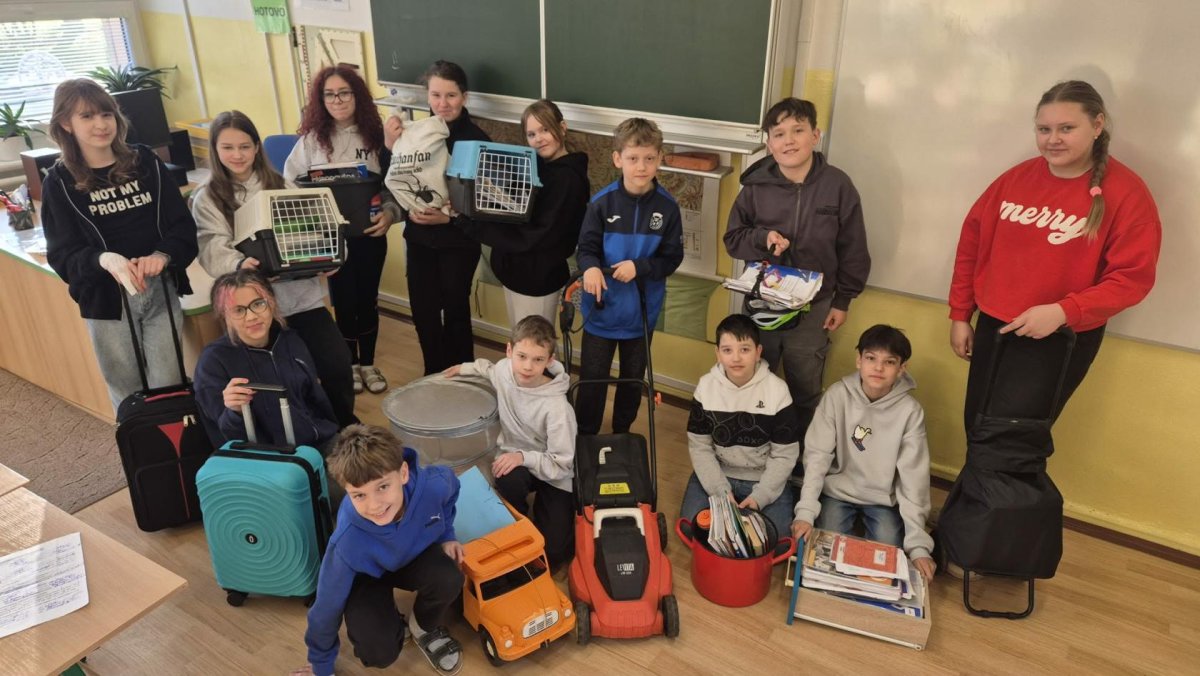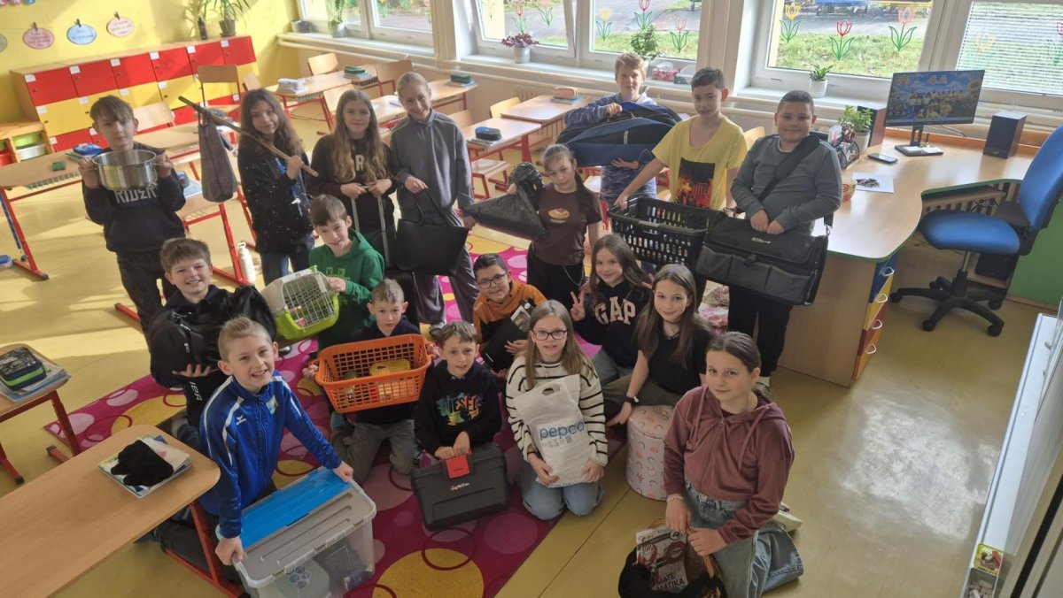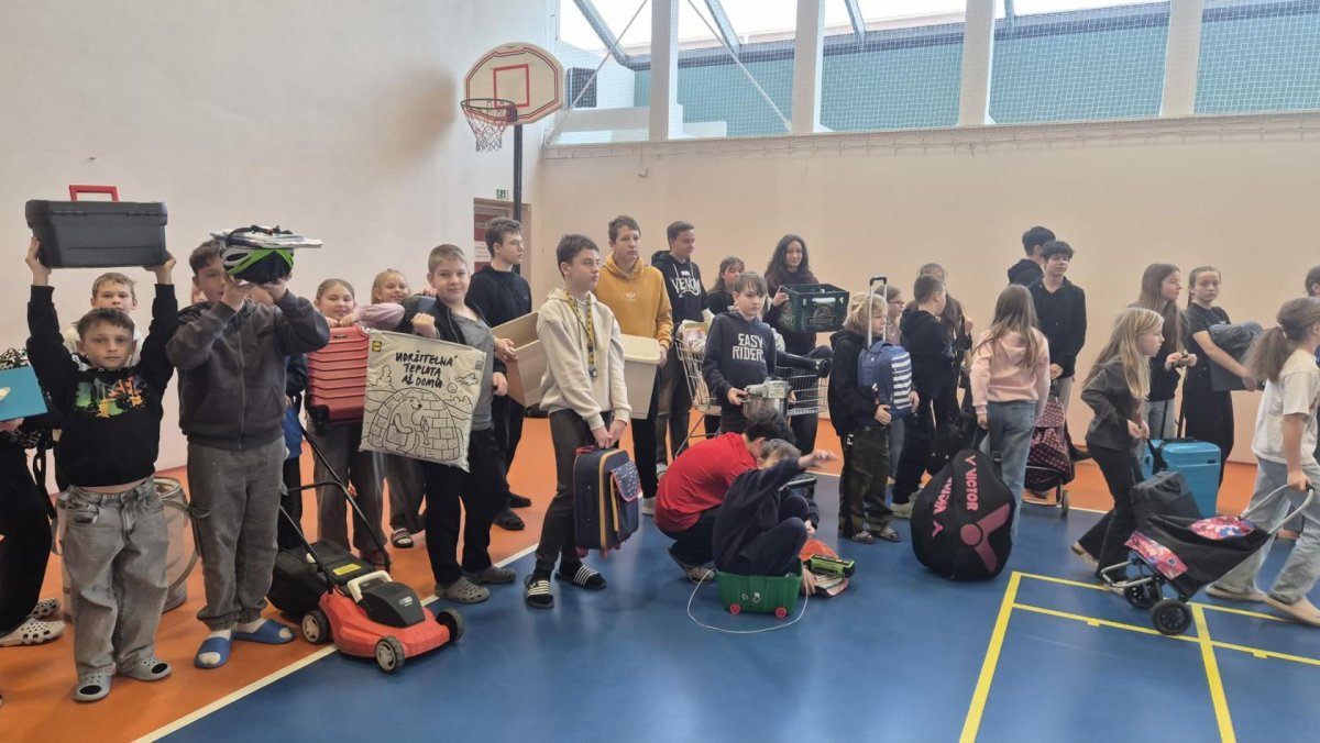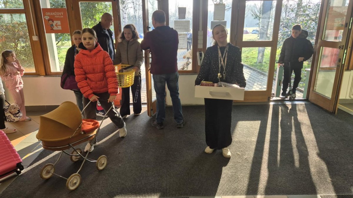 V rámci aprílového dne děti dorazily vybavené naprosto skvěle! Učebnice se vezly v nákupních vozících,sešity odpočívaly v hrncích...a někteří školáci dorazili i s výbavou,která by obstála i na expedici do divočiny...