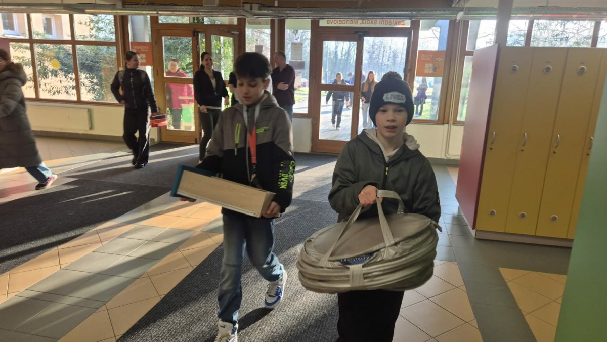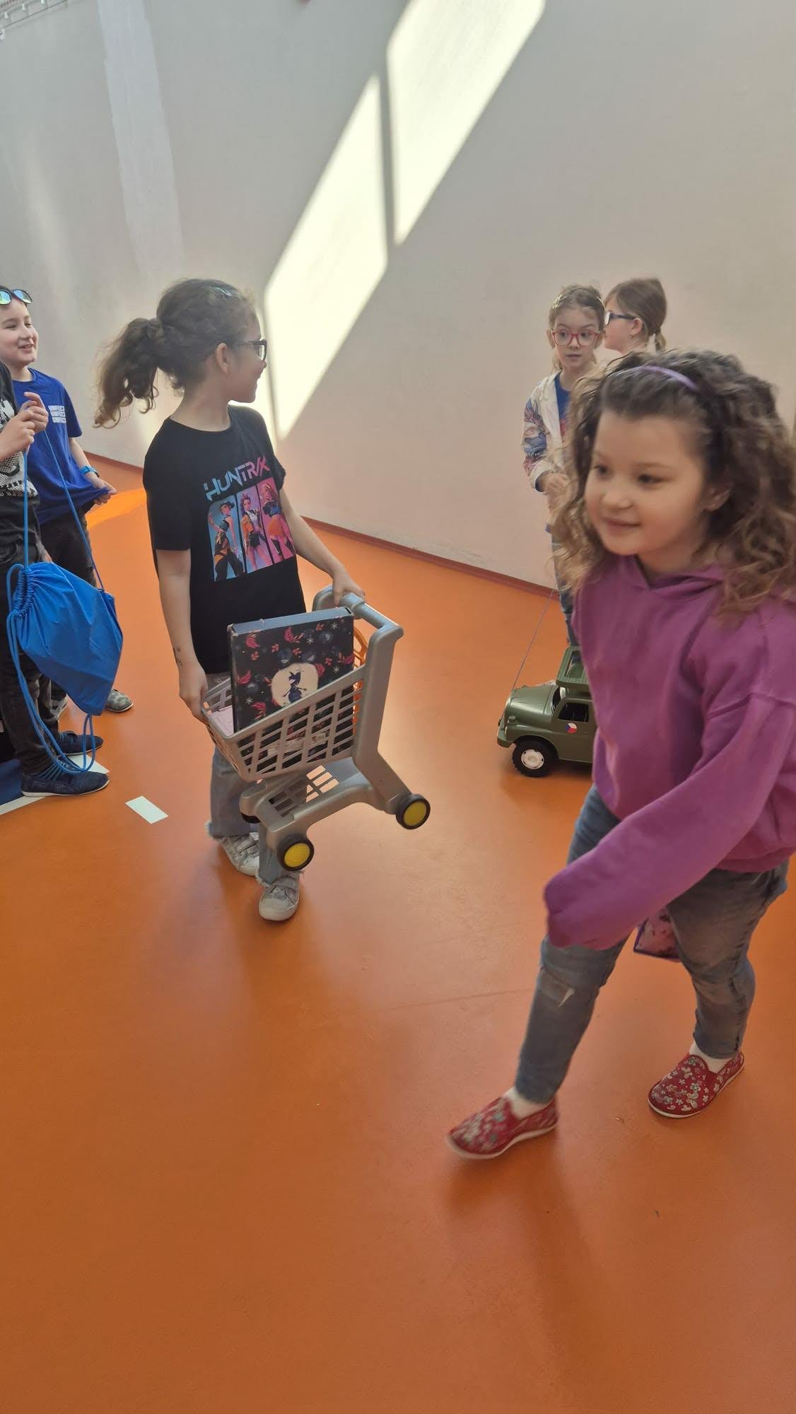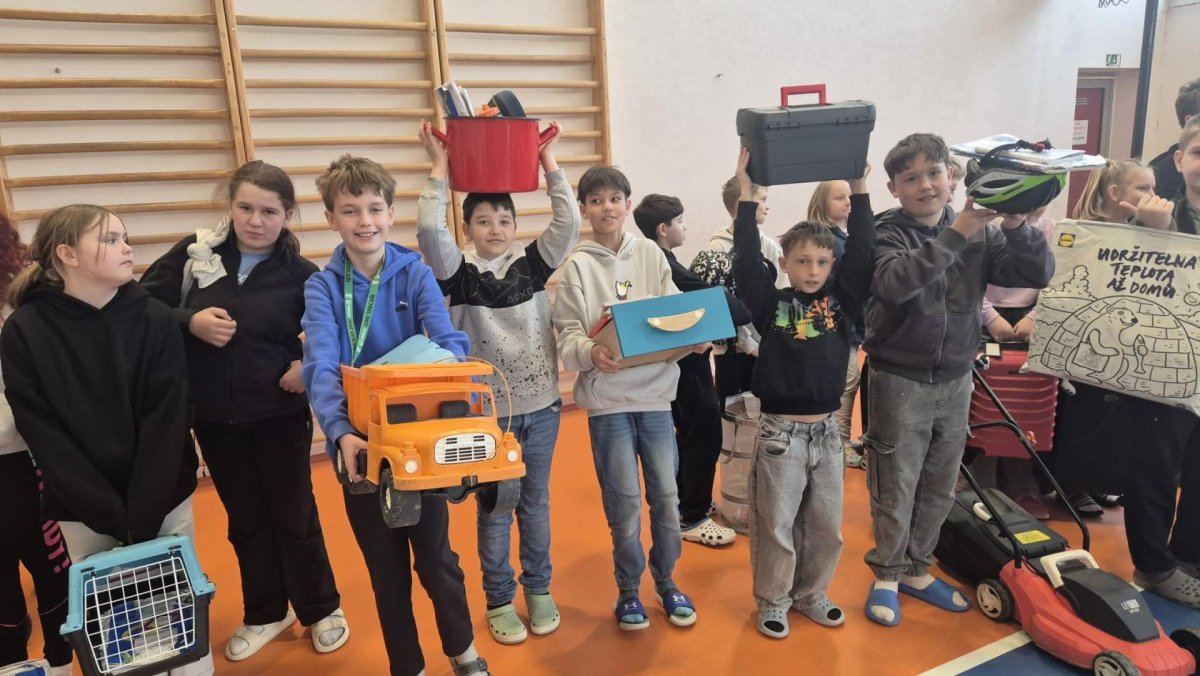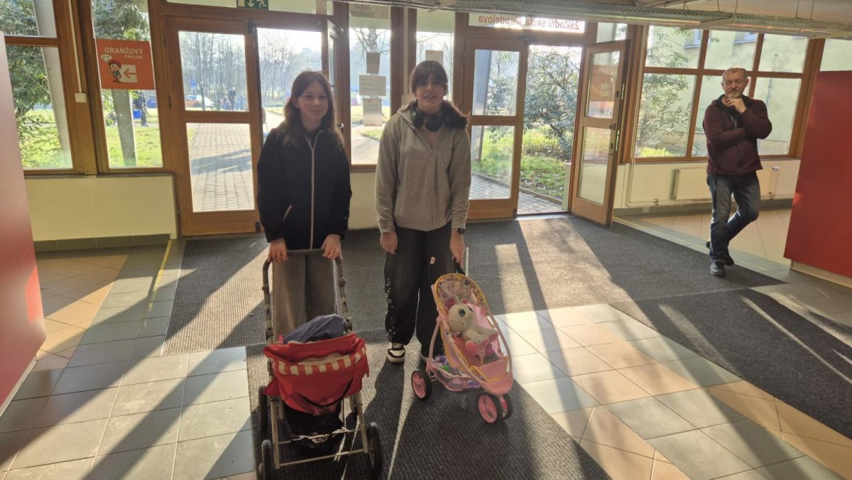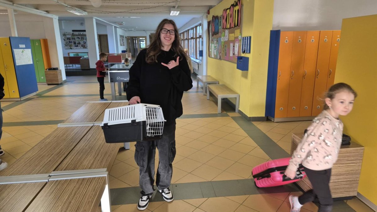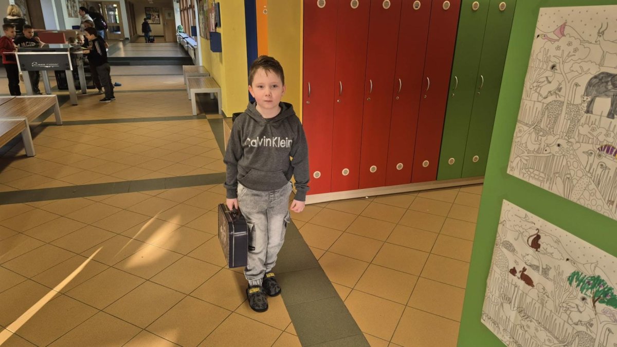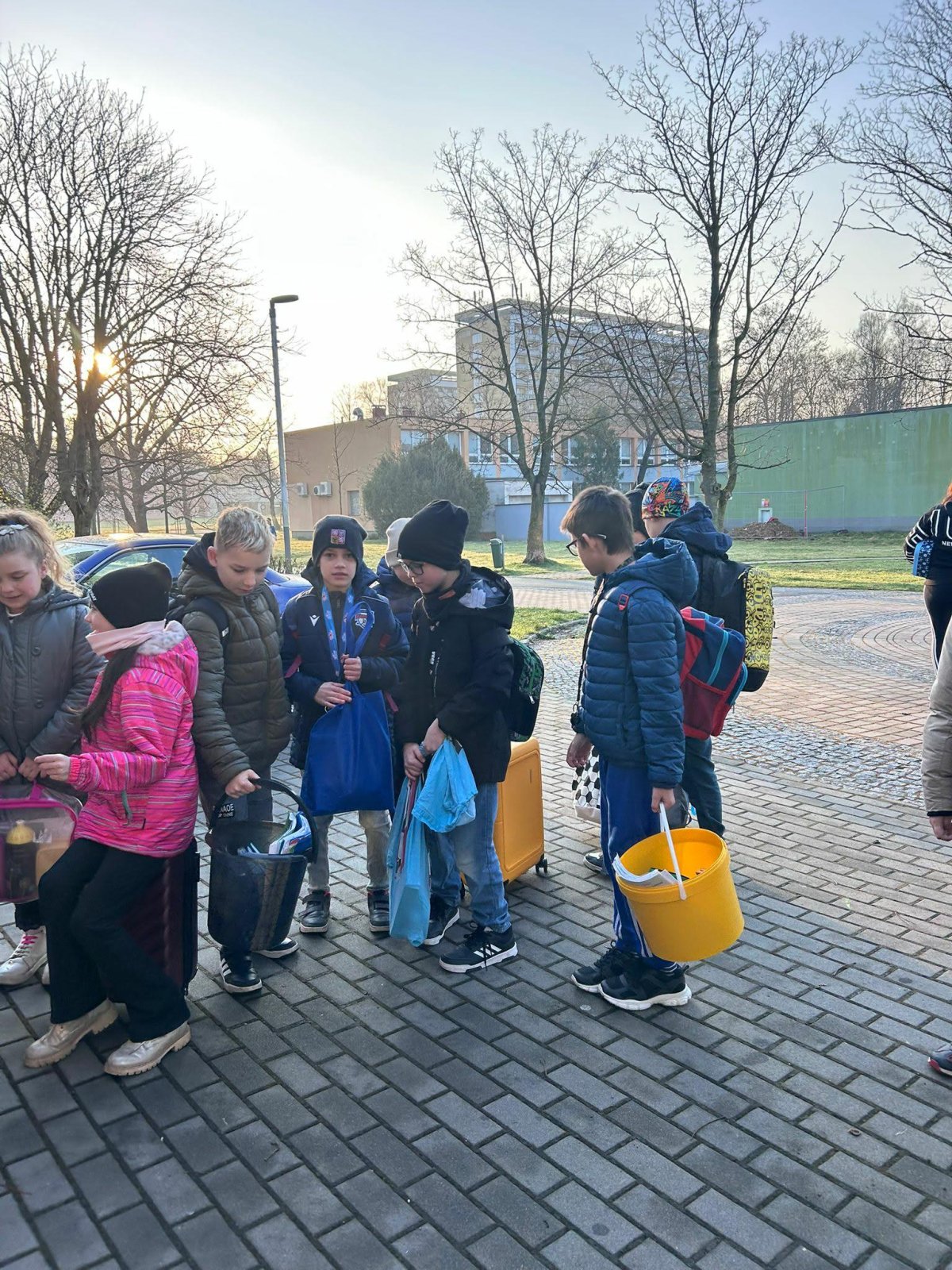 V rámci aprílového dne děti dorazily vybavené naprosto skvěle! Učebnice se vezly v nákupních vozících,sešity odpočívaly v hrncích...a někteří školáci dorazili i s výbavou,která by obstála i na expedici do divočiny...