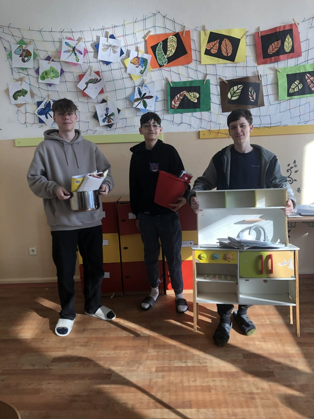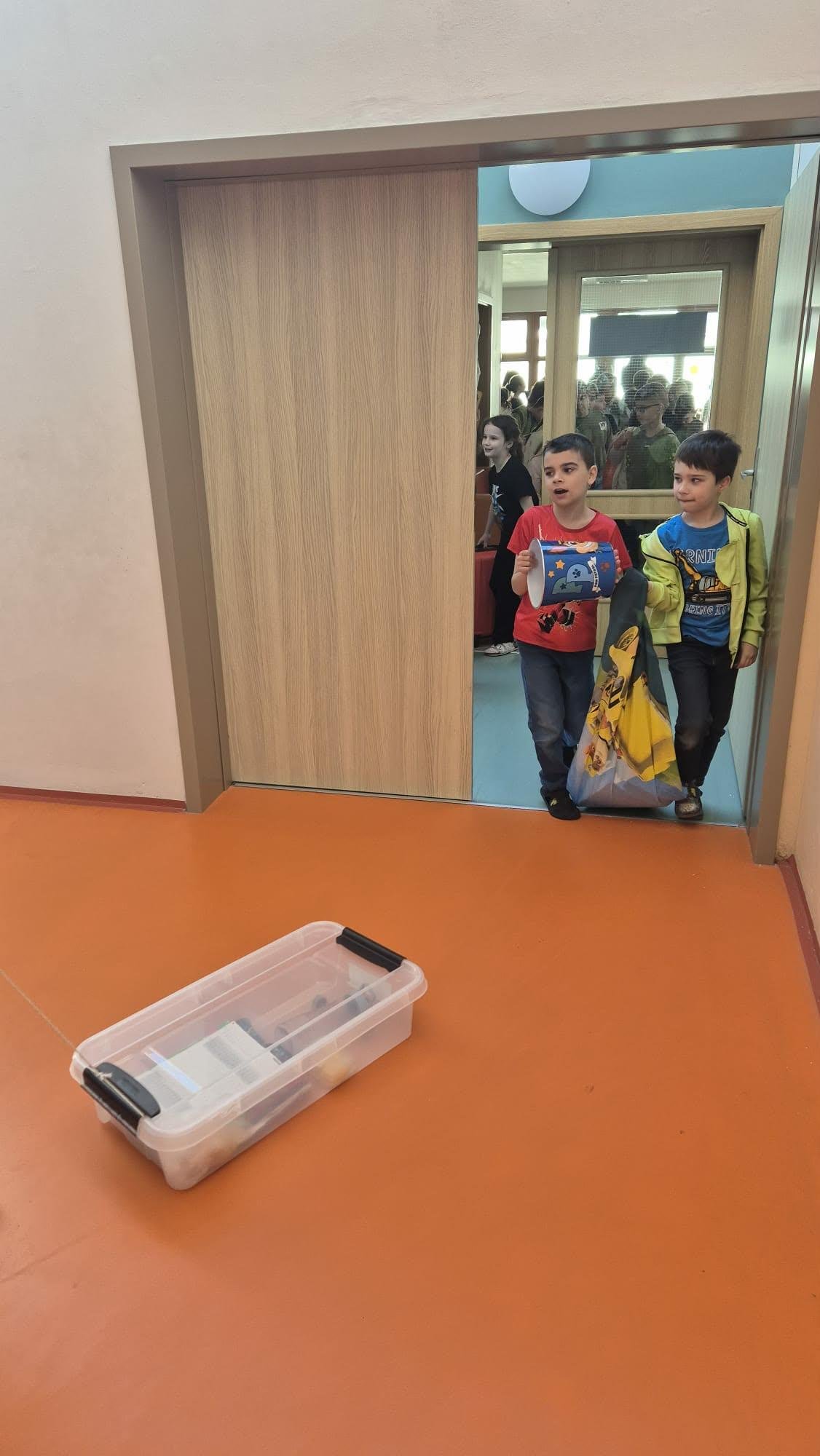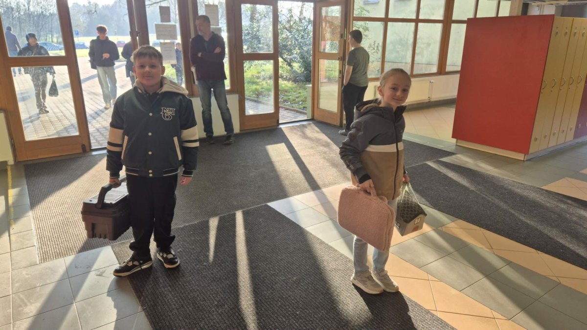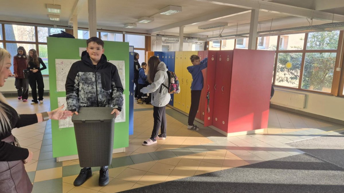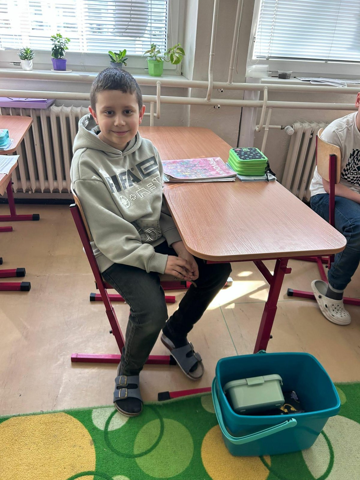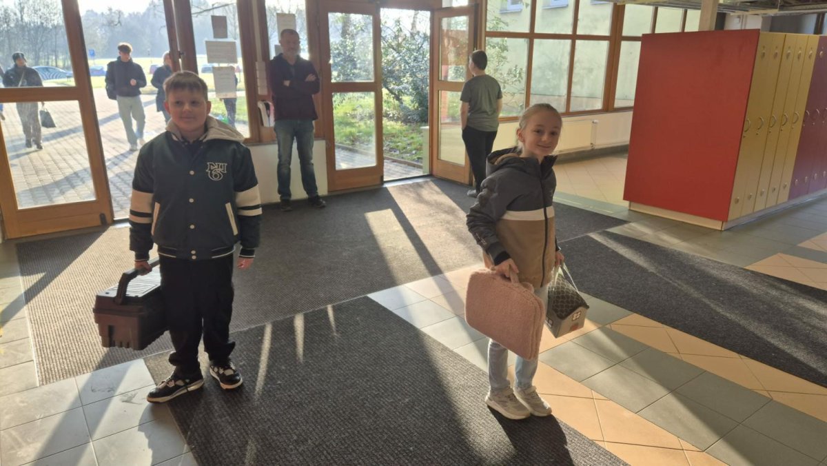 V rámci aprílového dne děti dorazily vybavené naprosto skvěle! Učebnice se vezly v nákupních vozících,sešity odpočívaly v hrncích...a někteří školáci dorazili i s výbavou,která by obstála i na expedici do divočiny...