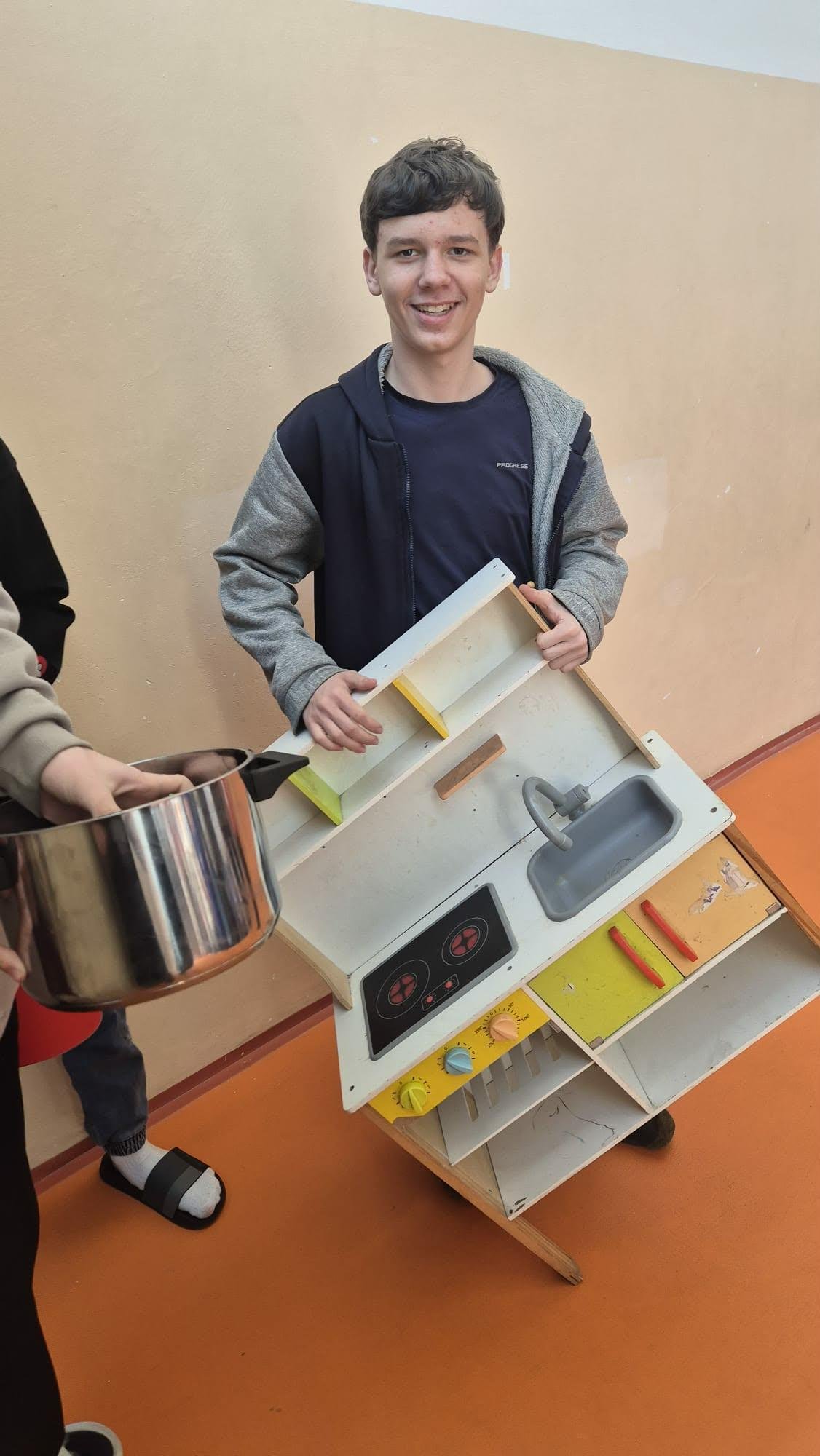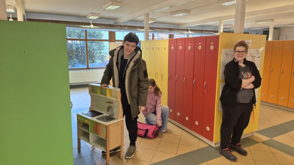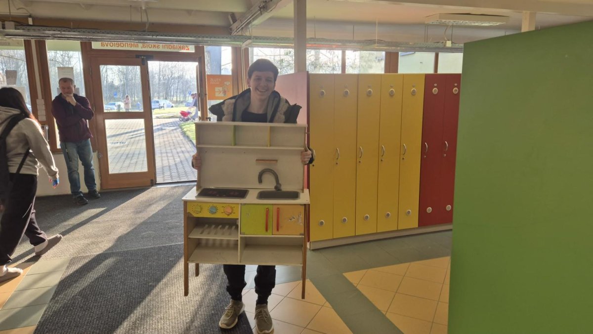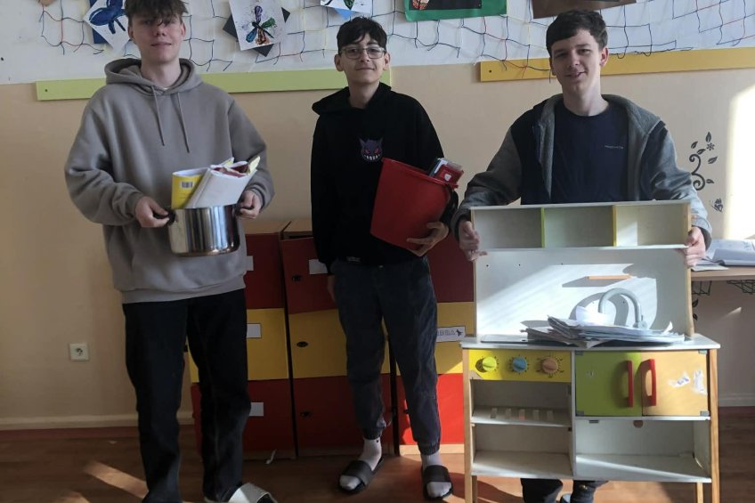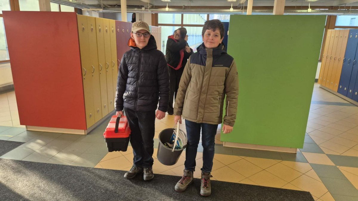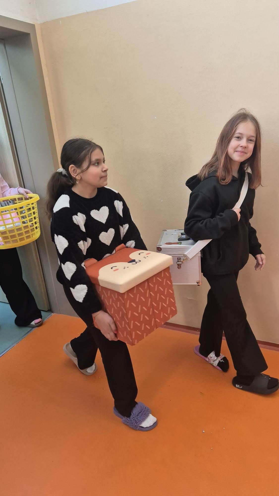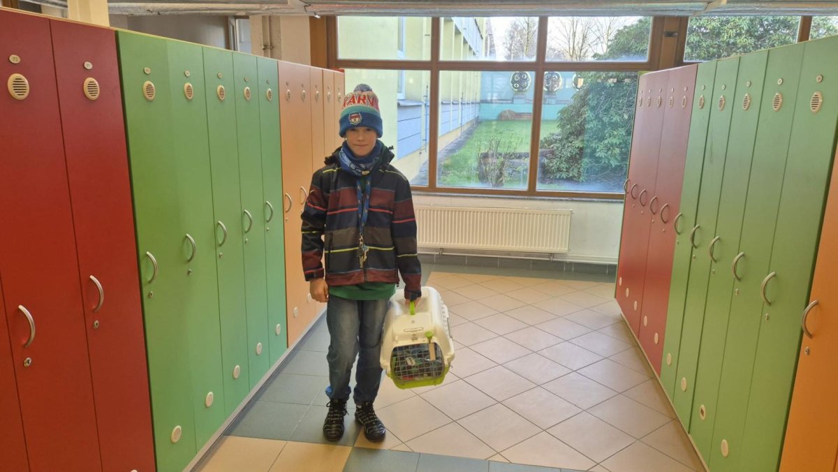 V rámci aprílového dne děti dorazily vybavené naprosto skvěle! Učebnice se vezly v nákupních vozících,sešity odpočívaly v hrncích...a někteří školáci dorazili i s výbavou,která by obstála i na expedici do divočiny...