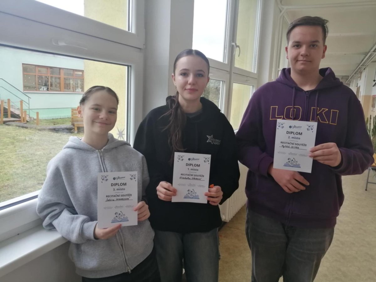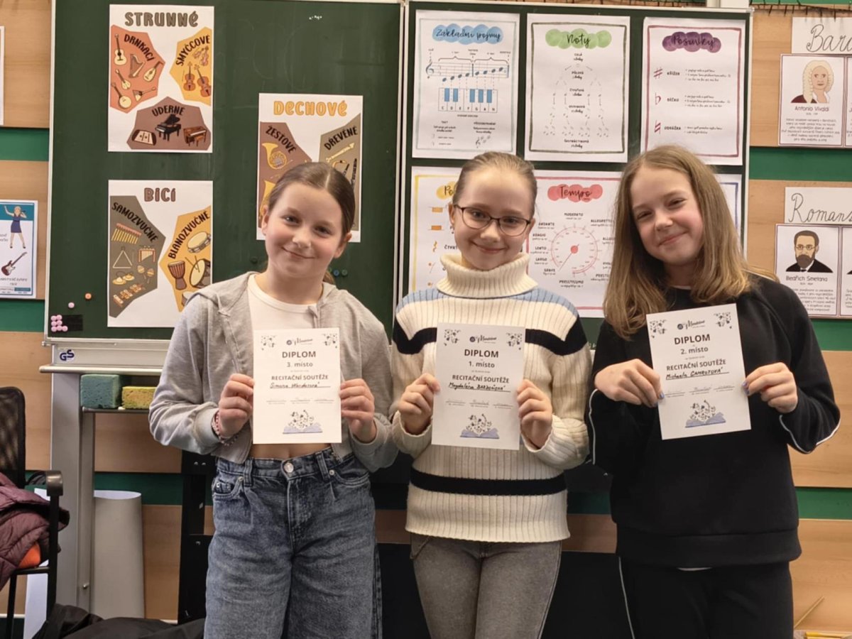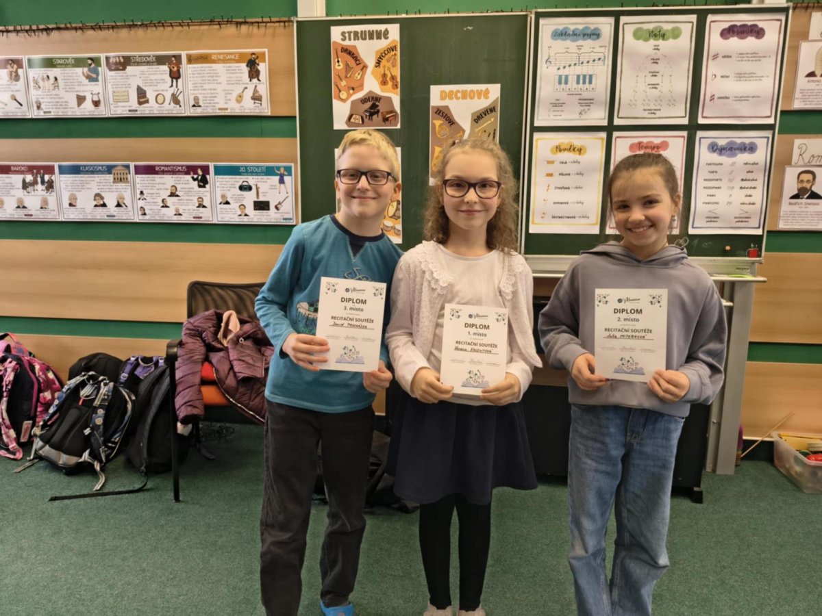 Dne 24. února se na naší škole uskutečnilo školní kolo recitační soutěže. Letošního ročníku se zúčastnilo celkem 32 nadaných recitátorů z 2. až 9. tříd, kteří se utkali v několika věkových kategoriích. Měli jsme možnost vyslechnout velmi rozmanité texty - od klasických básní až po moderní prózu. Celková úroveň byla vysoká a výkony žáků velmi vyrovnané, což porotě výběr těch nejlepších rozhodně neulehčilo. Všichni soutěžící zaslouží velkou pochvalu za odvahu a pečlivou přípravu. Do městského kola postupují Vanesa Valentová, Magdaléna Bardoňová, Sofie Šigutová a Elisabetha Sýkorová. Všem oceněným gratulujeme a postupujícím přejeme mnoho štěstí v dalším kole.